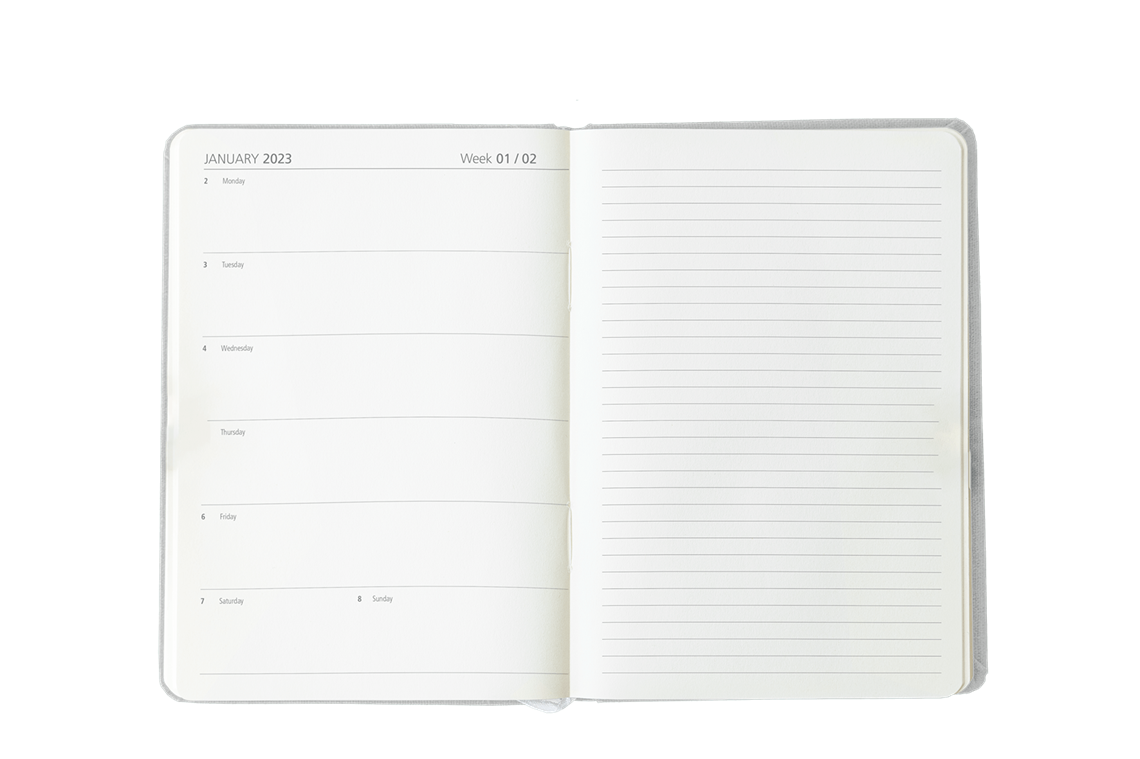 Our A5 hard cover bound week to view diaries can be customised with your own name. This diary has a slimmer feel with a classic and timeless design layout.
