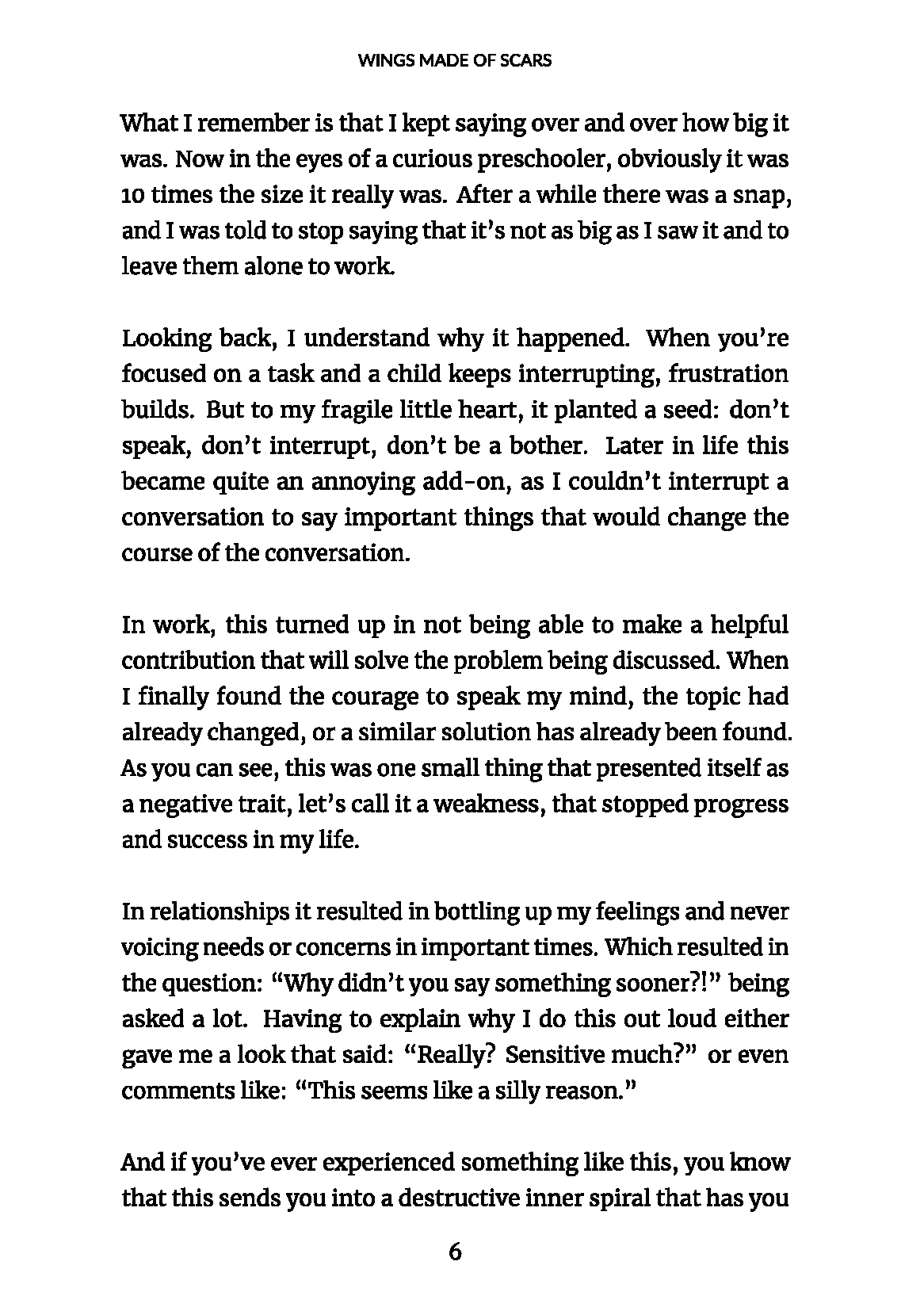 We all carry wounds - some visable, some hidden beneath the surface. In Wings Made of Scars, Natasha van Graan shares a heartfelt journey of trauma, healing and self-discovery. Through stories, reflections, and practical tools, she helps readers reconnect with the self they lost along the way. This is not just a book - it's an invitation to heal, grow, and finally see your scars as proof that you survived.