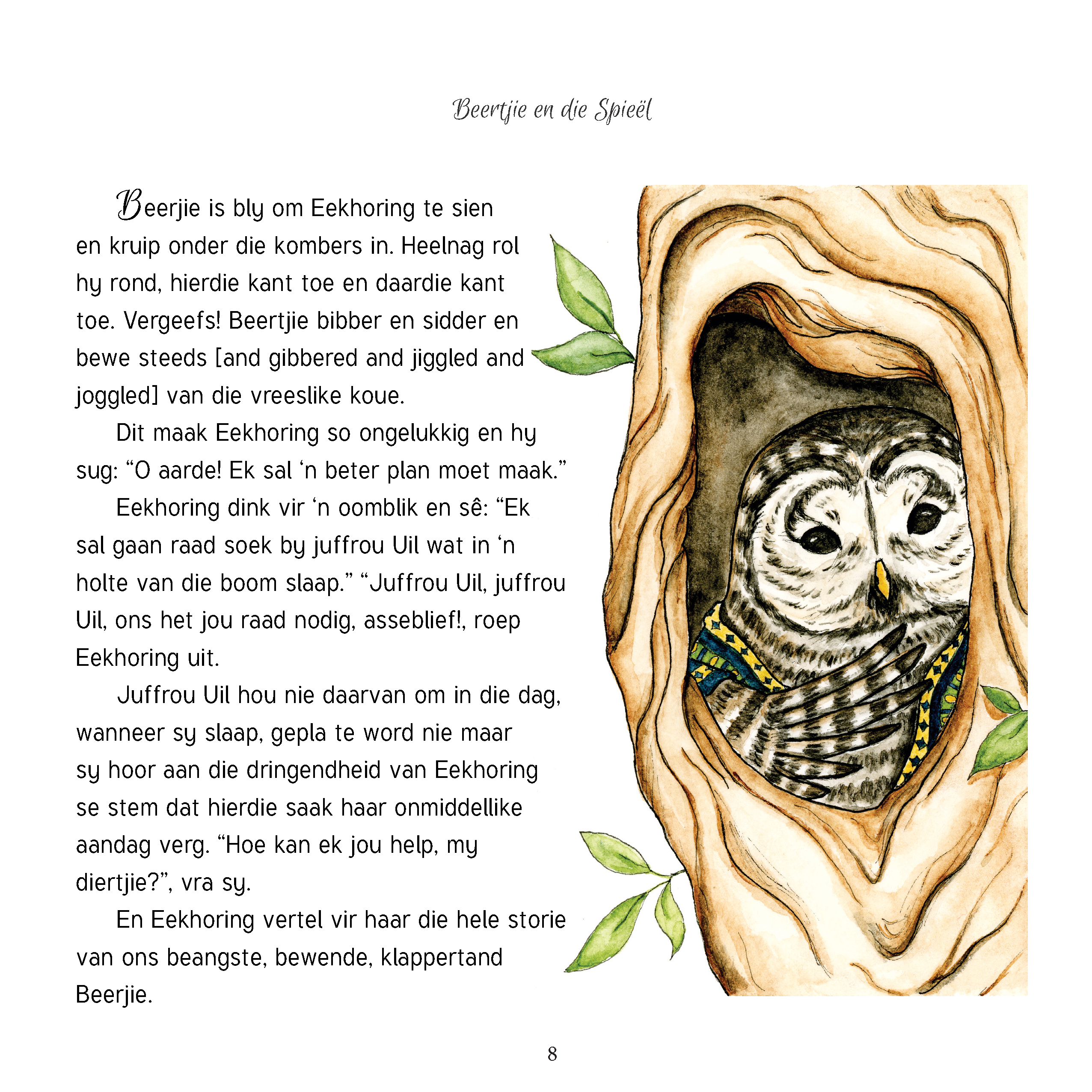 “Dis 'n magiese Spieël,” antwoord Eekhoring opgewonde. “Dit laat jou die waarheid sien wat die deur oopsluit om die babbelende, sidderende, kwetterende, skuddende koue uit te laat. Wyse uil het gesê dat die koue net kan uitkom soos dit ingekom het!”