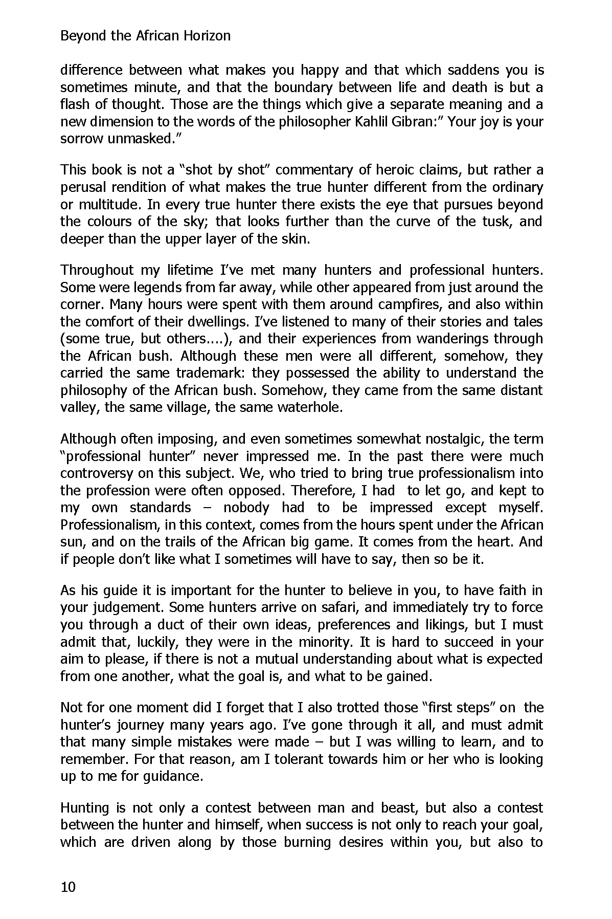 “Beyond the African Horizon” is a collection of hunting stories chosen to reflect the deep experiences of the Professional Hunter and his clients while hunting. Each story is carefully selected to capture the true spirit of ethical hunting and to reveal what goes on in the minds and hearts of true hunters during the “chase” and when he kneels by his quarry—thoughts and emotions he will seldom voice and often won’t even admit to himself.
