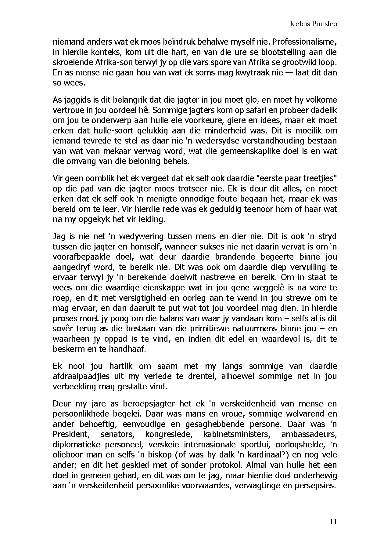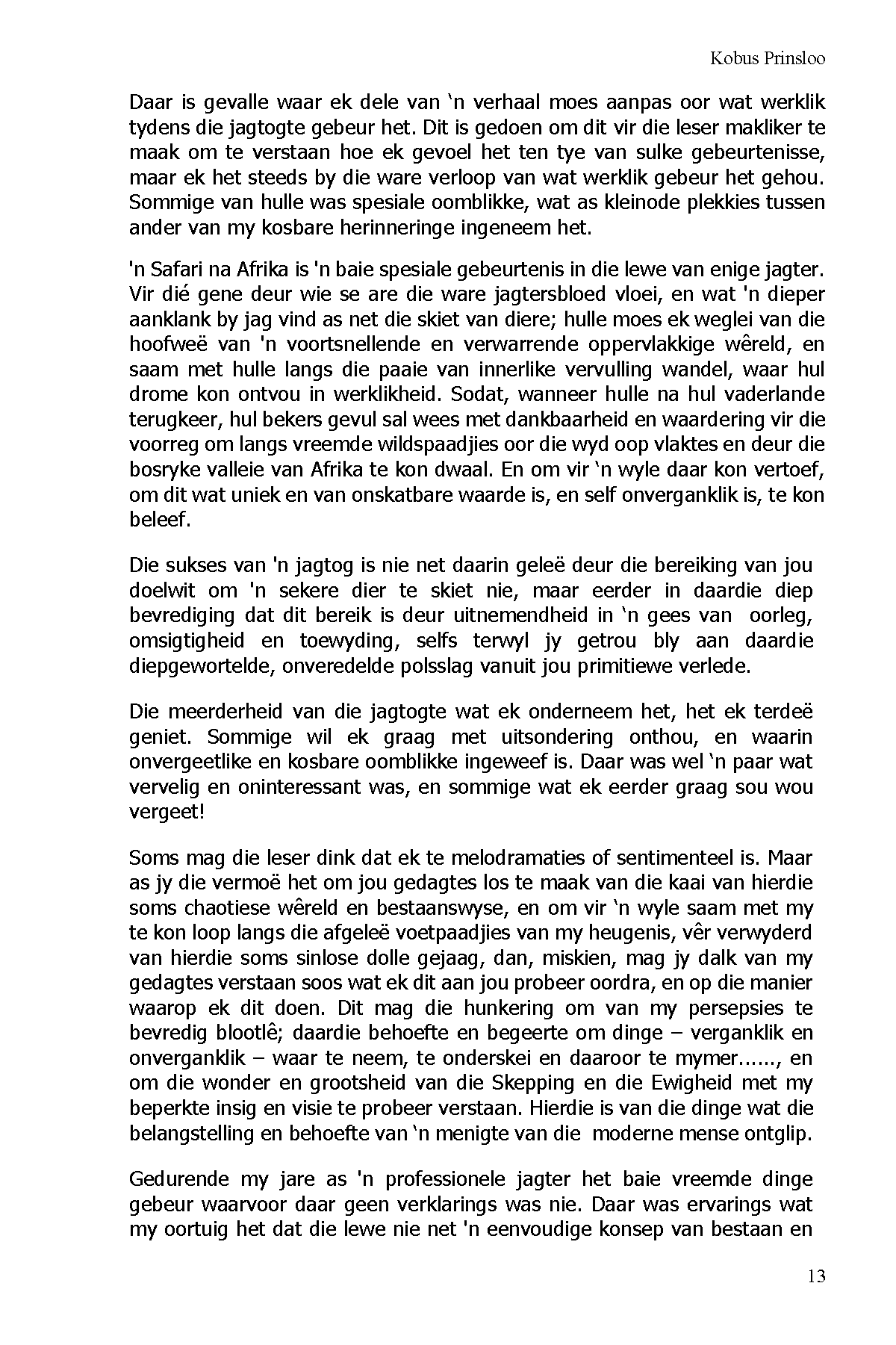 Die skrywer onthul dat jag vir die ware jagter nie so seer ‘n sport is nie, maar ‘n diep belewenis van die sin van lewe en die kompleksiteit van die Skepping en van die mens se verantwoordelikheid om dit reg te gebruik.