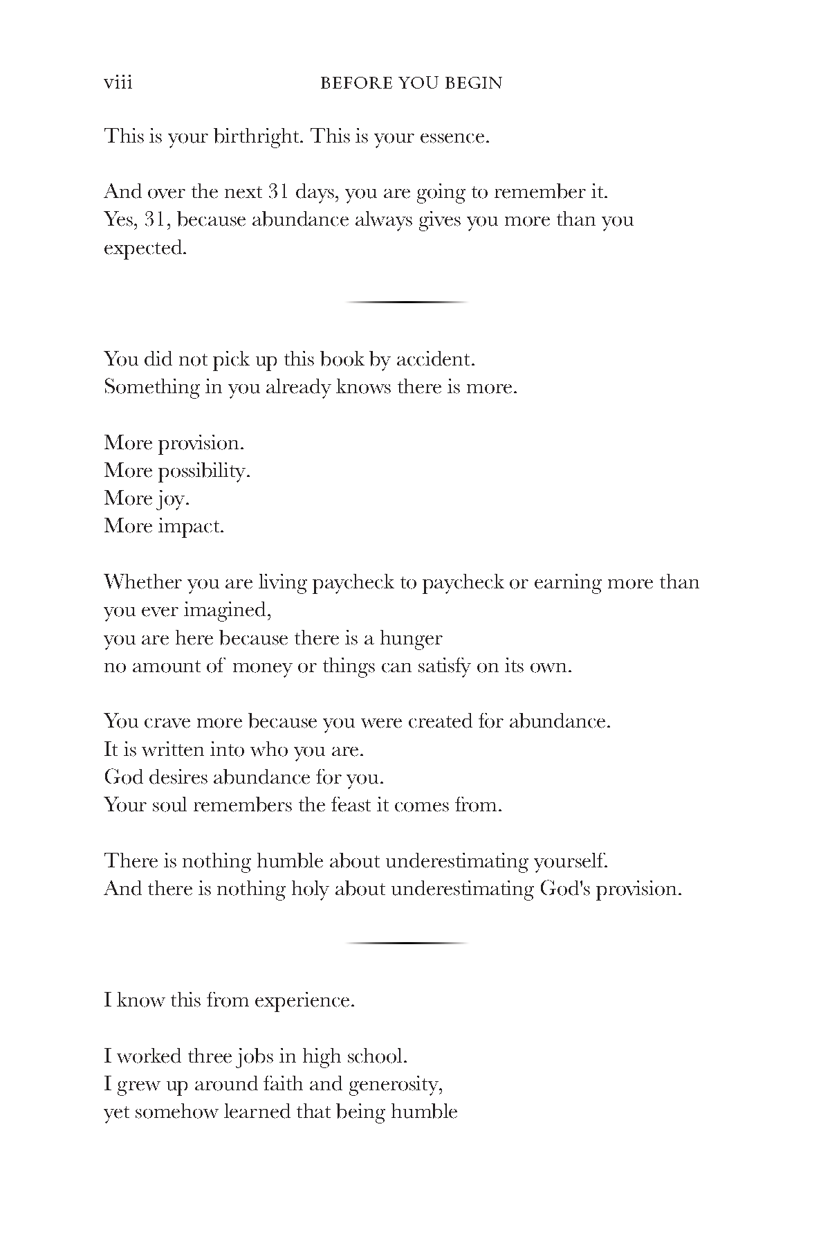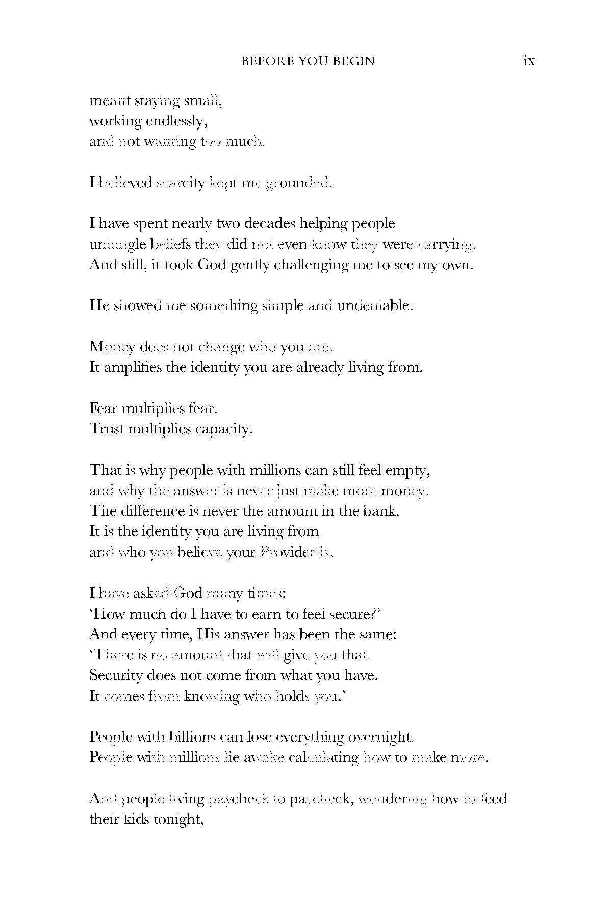 Written as intimate, heart-to-heart reflections—each day pairing Scripture with a first-person reflection voiced as God speaking directly to you, this devotional gently loosens scarcity thinking, performance-based faith, and the quiet pressure to ‘do more’ in order to receive more. Instead, it restores a truth many have forgotten: provision flows from identity, not effort.