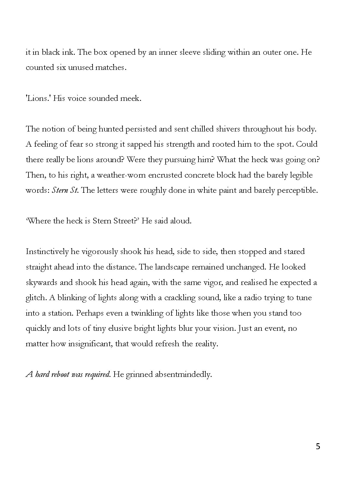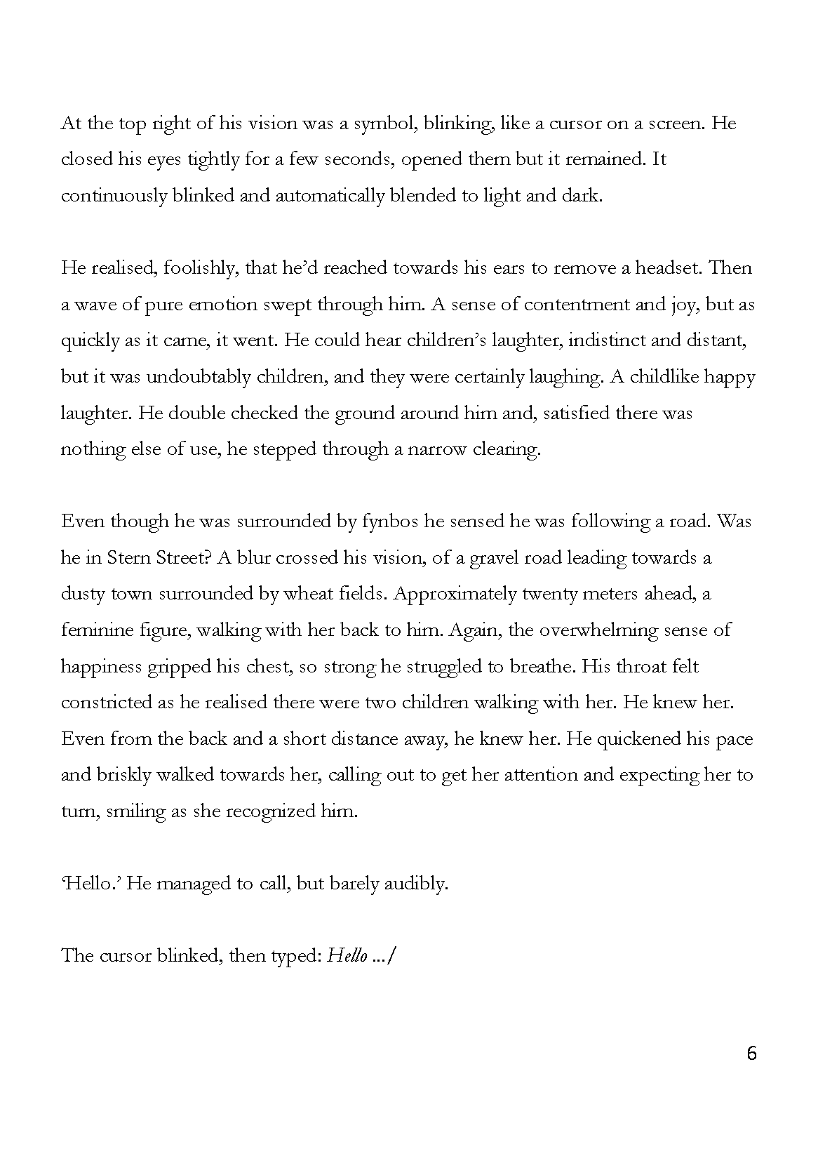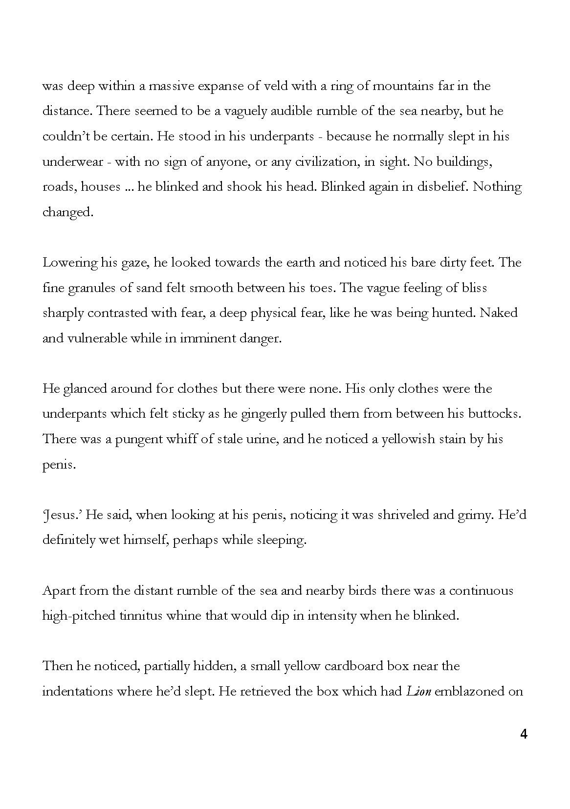 In a swift movement, he stood and took a few paces towards a gap in the thicket. Peering through revealed an endless landscape. He was deep within a massive expanse of veld with a ring of mountains far in the distance. There seemed to be a vaguely audible rumble of the sea nearby, but he couldn’t be certain. He stood in his underpants with no sign of anyone, or any civilization, in sight. No buildings, roads, houses ...