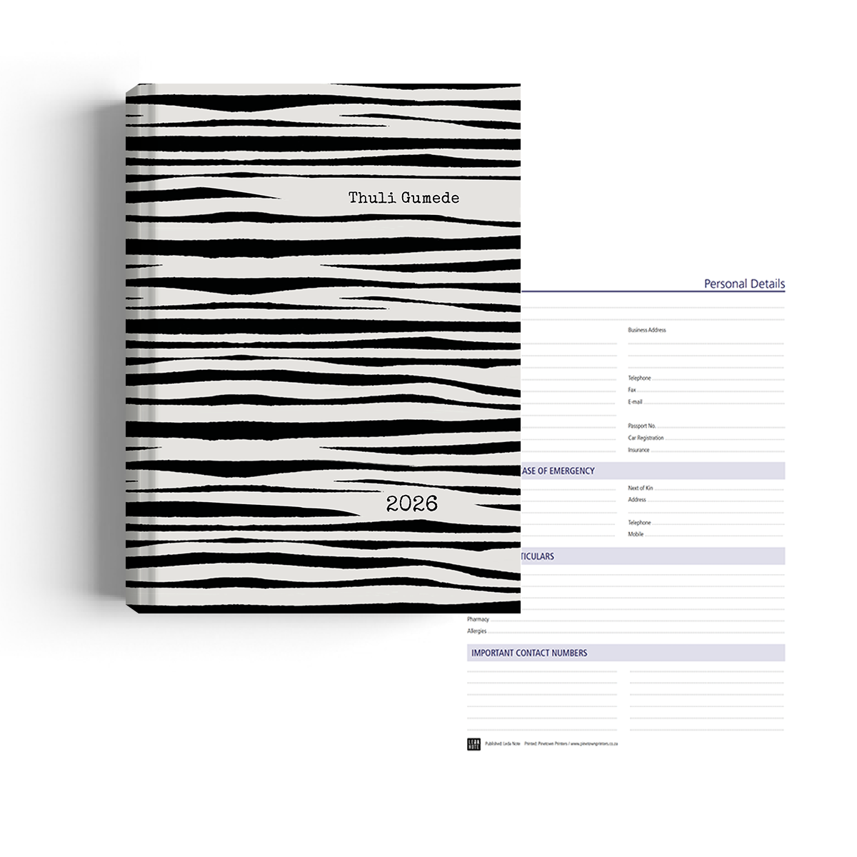 Cover: Printed personalised cover available in gloss or matt finish.