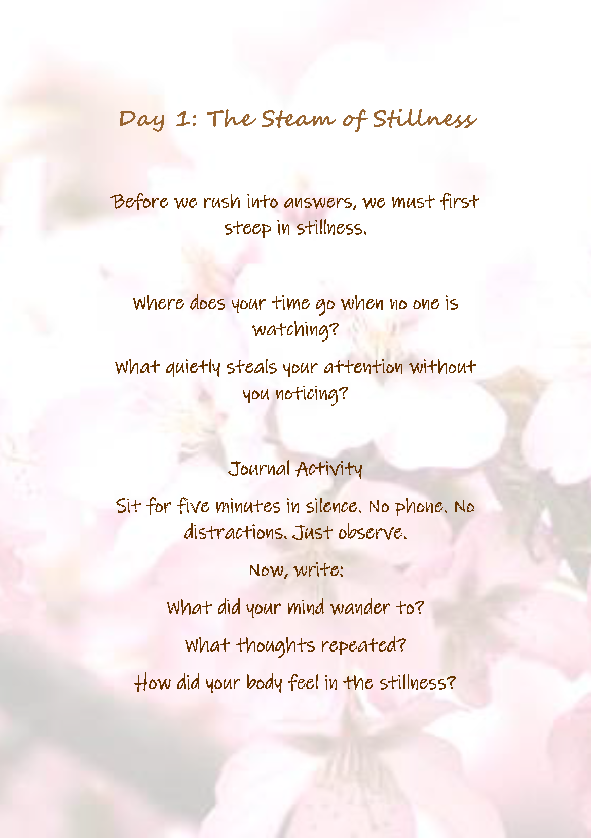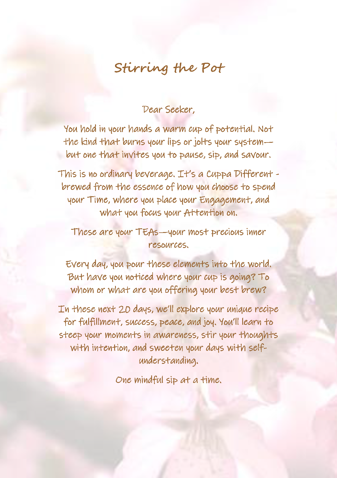 A Cuppa T.E.A is a 20-day journey into the art of where you pour your Time, how you infuse your Energy, and where you rest your Attention. Each page is a gentle stirring of thought and feeling, inviting you to notice what fills your cup, what drains it, and what deserves the finest pour. Like a well-brewed tea, transformation comes slowly, steeping through moments of stillness and intention. By journey's end, you'll hold in your hands, a way of living, that is warm, mindful, and uniquely your own.