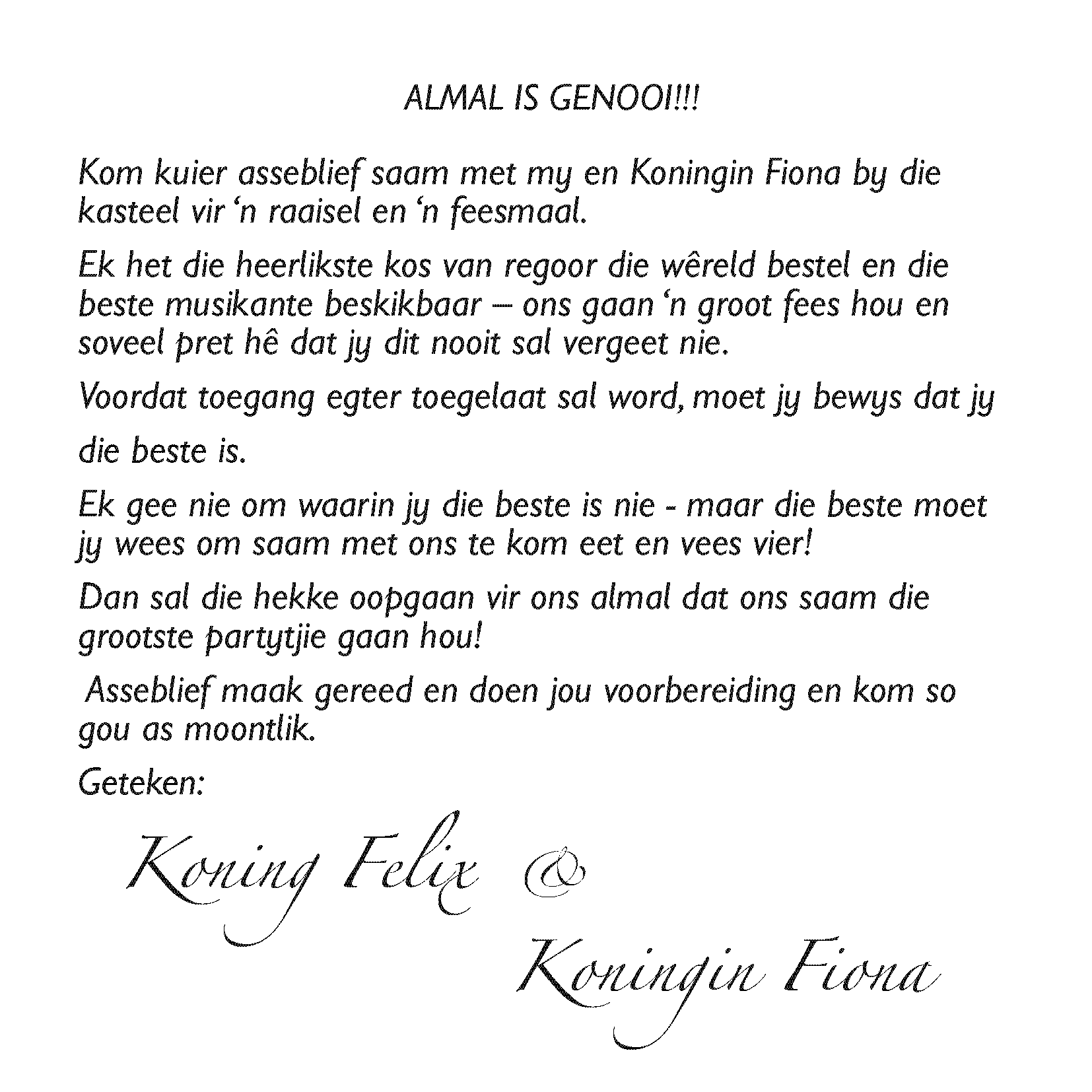 Hy het dadelik sy vrou en al die mense in sy koninkryk betrek om die raaisel te help oplos. Die mense is ook genooi om by hom en die Koningin by die Groot Banket, aan te sluit.