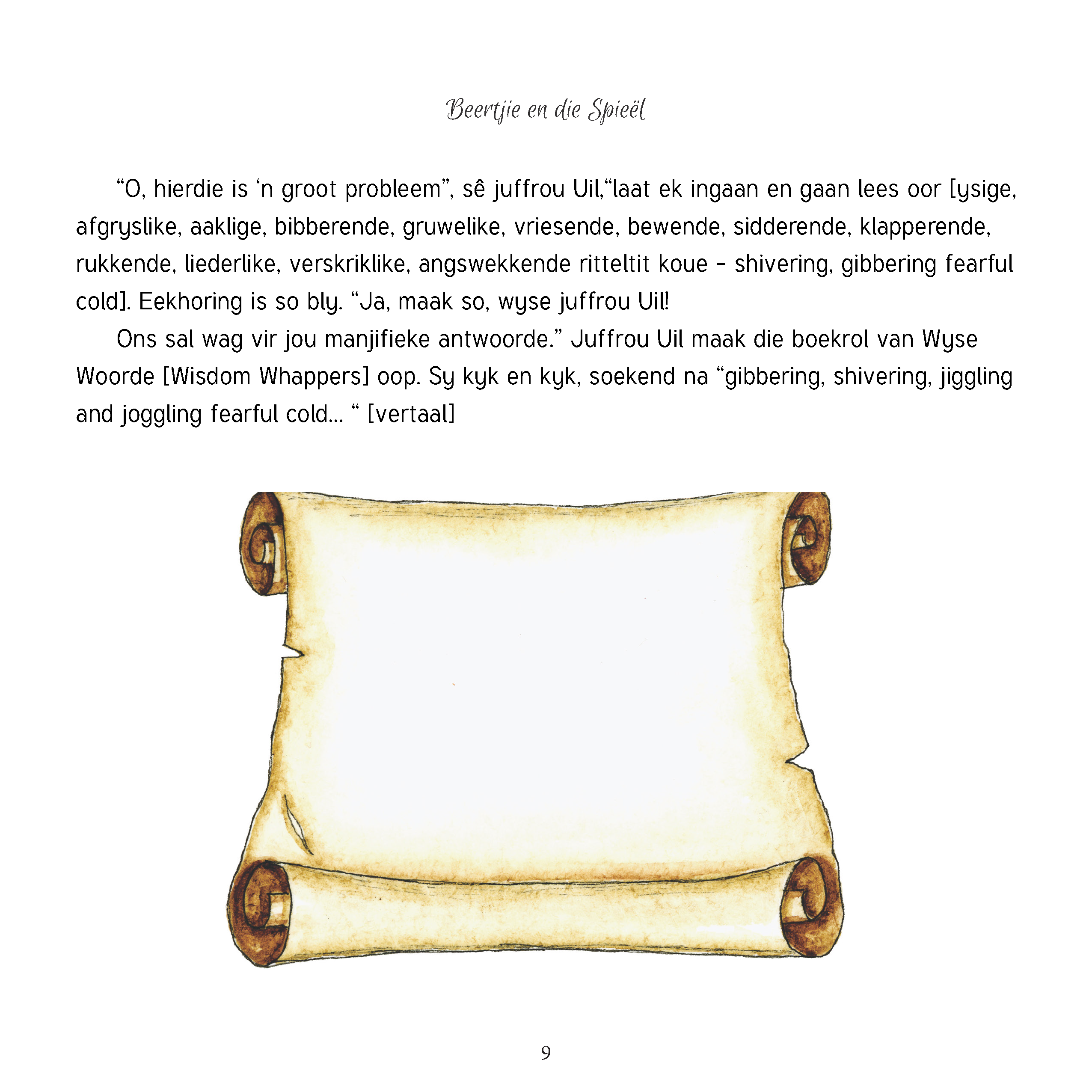 “Dis 'n magiese Spieël,” antwoord Eekhoring opgewonde. “Dit laat jou die waarheid sien wat die deur oopsluit om die babbelende, sidderende, kwetterende, skuddende koue uit te laat. Wyse uil het gesê dat die koue net kan uitkom soos dit ingekom het!”