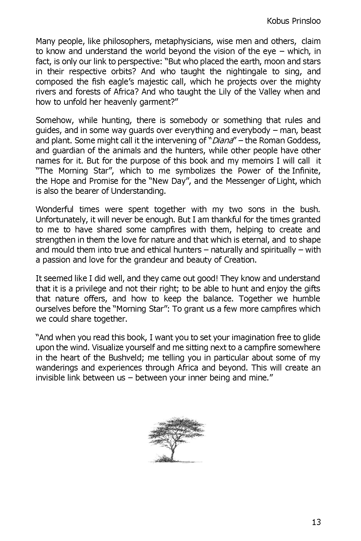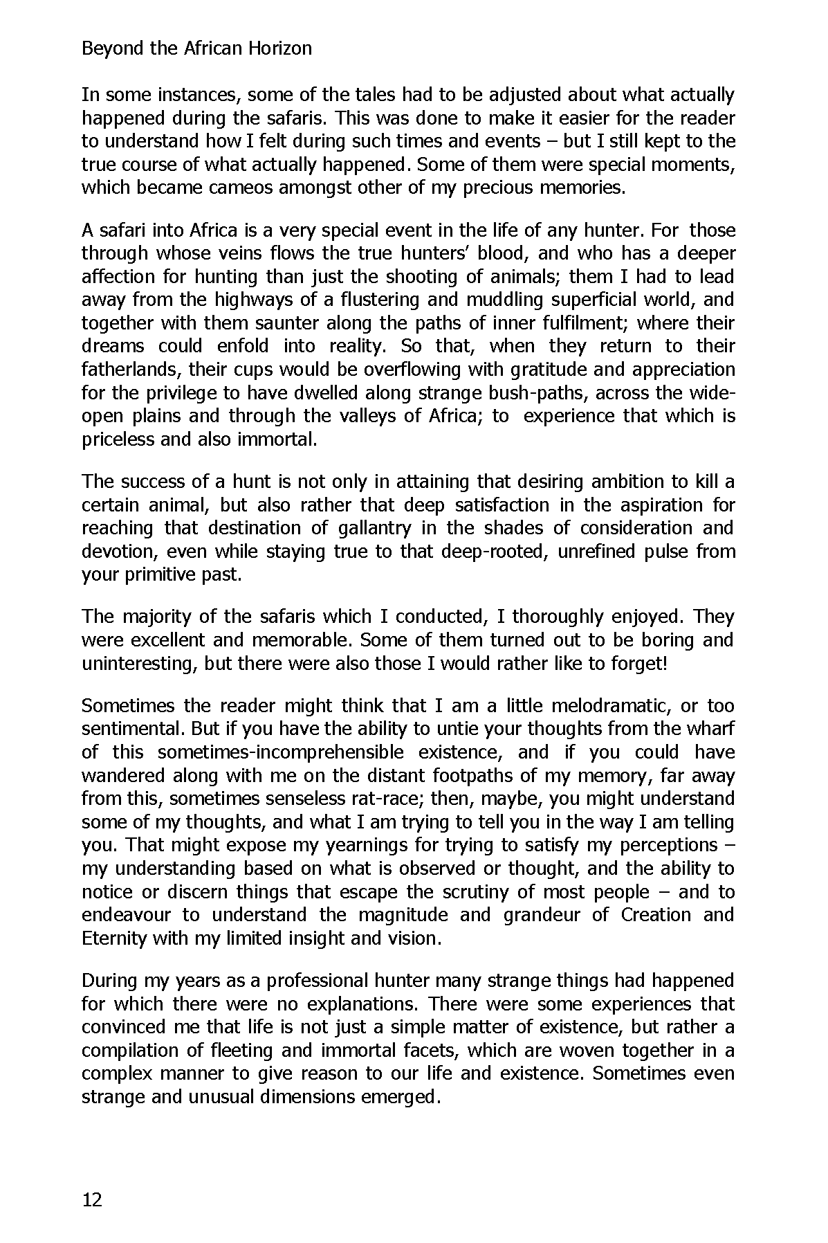 “Beyond the African Horizon” is a collection of hunting stories chosen to reflect the deep experiences of the Professional Hunter and his clients while hunting. Each story is carefully selected to capture the true spirit of ethical hunting and to reveal what goes on in the minds and hearts of true hunters during the “chase” and when he kneels by his quarry—thoughts and emotions he will seldom voice and often won’t even admit to himself.
