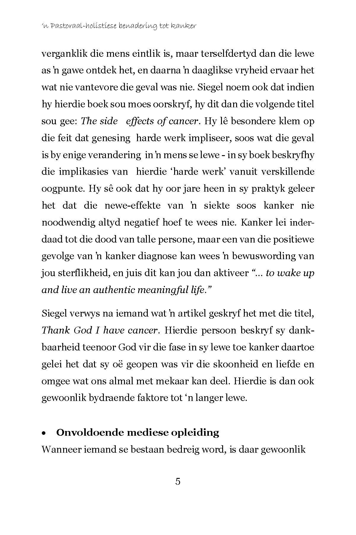 om by voorbaat handdoek in te gooi nie. Sou fisiese genesing egter nie uiteindetik realiseer nie dan lei so 'n benadering gewoonlik tot'n groot stuk innerlike vryheid en vrede in verhouding tot God en medemens.